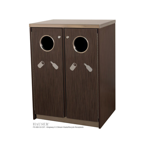 Kingsway III 2 Stream Waste/Recycle ReceptaclePS-906-32-14-CST - Kingsway III Waste/Recycle Receptacle Our Kingsway III Waste/Recycle receptacle features a brushed stainless steel top, brushed stainless steel gaskets, and plastic laminate front & back panels. The 2 stream unit shown here uses 2 individual poly liners (27 gal / 102.25 L each). Available in a variety of stream options and openings. For indoor use only
