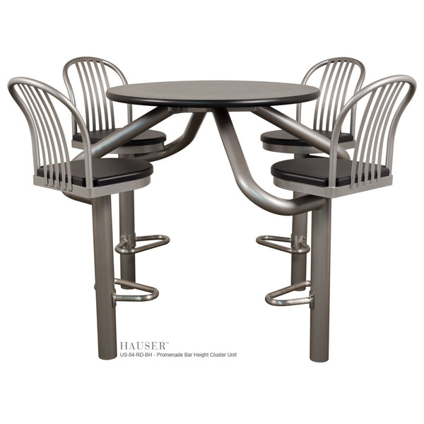 Promenade Bar Height Cluster UnitUS-84-RD-BH Promenade Our Promenade Bar Height Cluster unit is shown here with our 'Pewter' powdercoat frame, 'Fusion' seats, and a Plastic Laminate table top with Vinyl Edge. For indoor use only